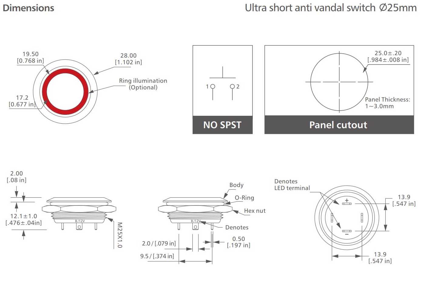 In terms of its technical data, the L25U Waterproof Anti Vandal Switch comes with an electrical rating of 50mA/24VDC and in multiple function options include momentary. It is also built with a solder lug terminal which measures approximately two millimeters in length and half a millimeter in width.